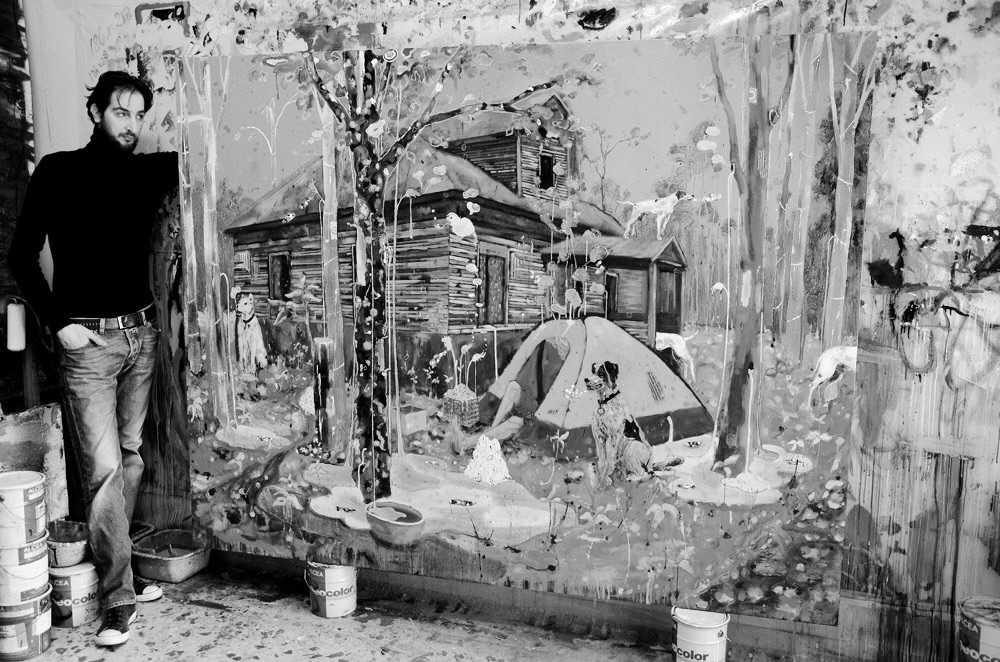 Il mio ciclo di opere più recente ha visto in scena dei retro-giardini di case private infestati da scimmie, orsi o cani intenti a raccogliere colori molto acidi grondanti dagli alberi. Per Giorni Felici ho mantenuto in linea di massima lo stesso scenario, ma ho esasperato sia l’aspetto cromatico che quello dell’immagine stessa dove ho dato risalto a degli elementi destabilizzanti che movimentano l’immagine stessa con la loro frenesia e la loro generosità nel rilasciare tracce cromatiche. Giorni Felici a Casa Testori genera così frenesia nella pittura stessa.