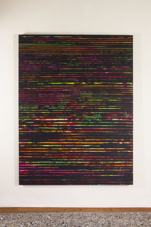 Una saracinesca è calata sul mondo e tra un listello e l’altro lascia intravvedere il bagliore di un orizzonte perduto. L’opera di Paolo Bini, che si sviluppa in verticale come se fosse una vera finestra, in realtà gioca su un’ambiguità che crea un’attesa in chi sta guardando. Cosa c’è al di là? E l’effetto saracinesca creato dai nastri tesi sulla tela è quello di un nascondere o di un lasciar trapelare?