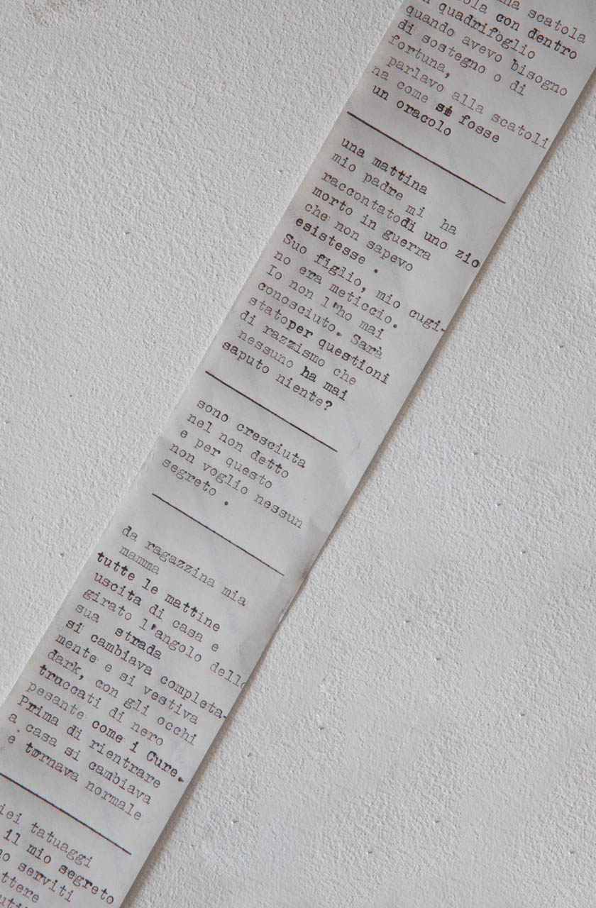 Nella sala di Casa Testori JEST dialoga con la storia del suo illustre inquilino srotolando le storie segrete sul lungo tavolo di fronte alla fotografia a partire da una macchina da scrivere che a sua volta è protagonista di una messa in atto del progetto. Un ventaglio originale, posto all’estremità del tavolo, guarda alla fotografia sulla parete. Due sedie si confrontano dalle estremità del tavolo in un dialogo immaginario, mentre le fotografie ai lati ribadiscono l’invito a guardare con attenzione.