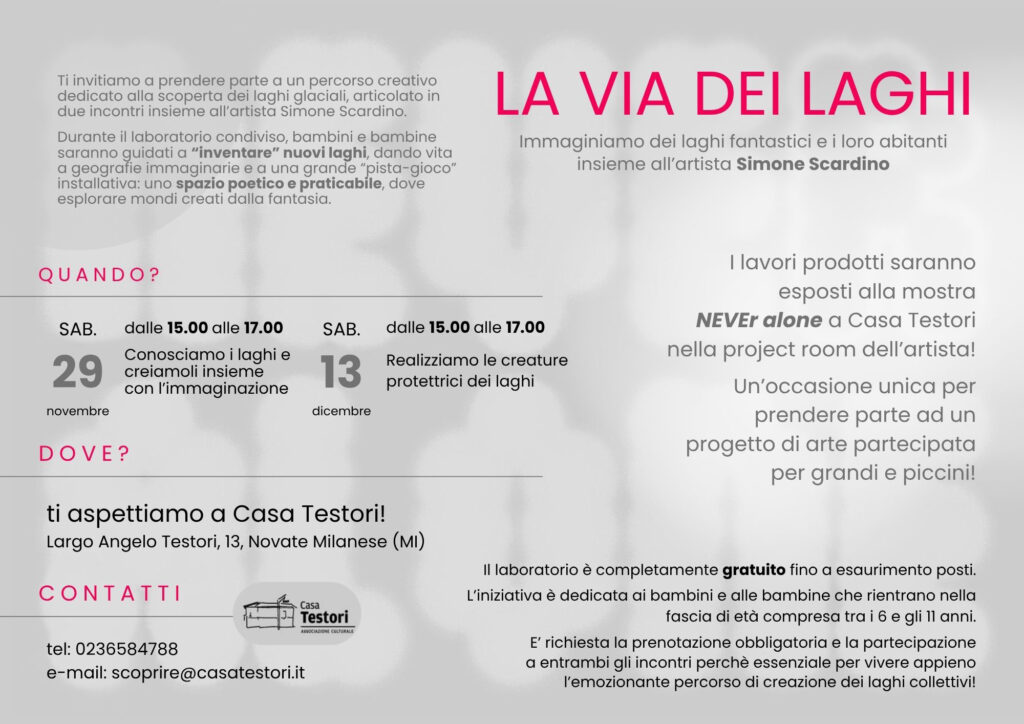 Tra le attività legate a “NEVEr alone” c’è il progetto “La Via dei Laghi” dell’artista Simone Scardino. Sabato 29 novembre e sabato 13 dicembre, dalle 15:00 alle 17:00, bambini e bambine di età compresa tra 6 e 11 anni – insieme a genitori e accompagnatori – potranno creare mondi immaginari, popolati da creature fantastiche, a partire dai laghi glaciali. Unendo fantasia e attenzione ai cambiamenti climatici, sarà un’occasione per sperimentare insieme, creando una grande opera d’arte collettiva che sarà esposta nella project room dell’artista curata da Rosita Ronzini, visitabile a Casa Testori dal 24 gennaio al 28 marzo 2026 all’interno della mostra “NEVEr alone”.