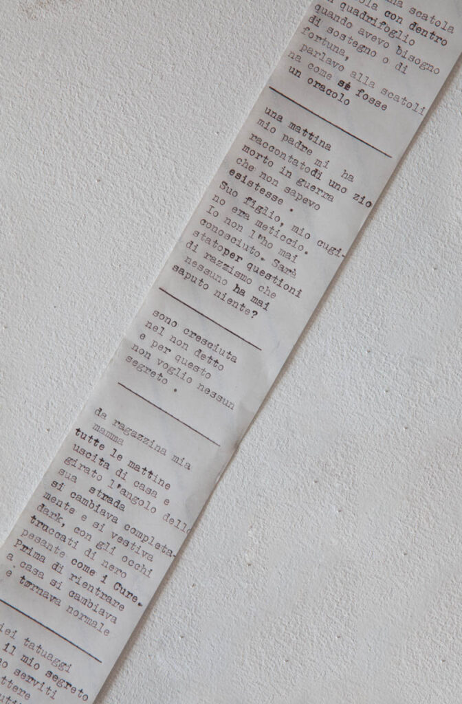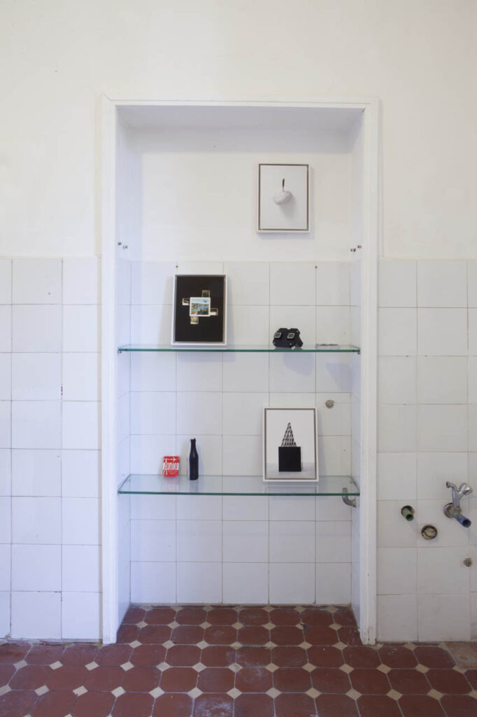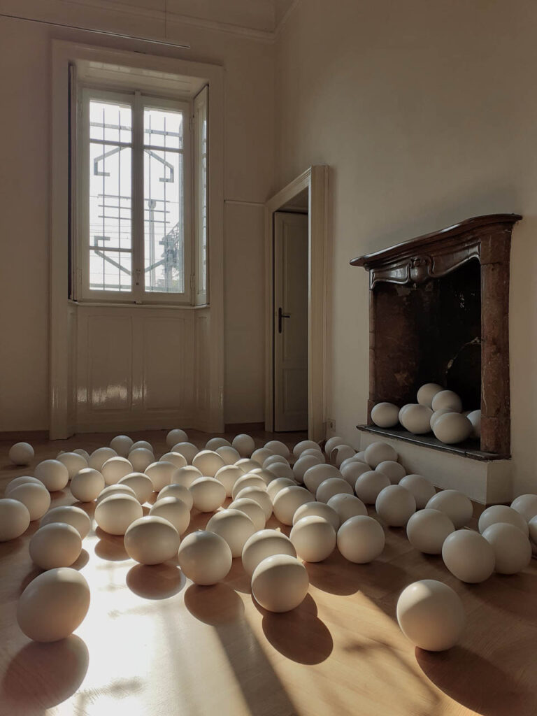 Dal lato opposto della casa, nella grande sala che termina con la veranda, sono esposte due installazioni di Ilaria Turba