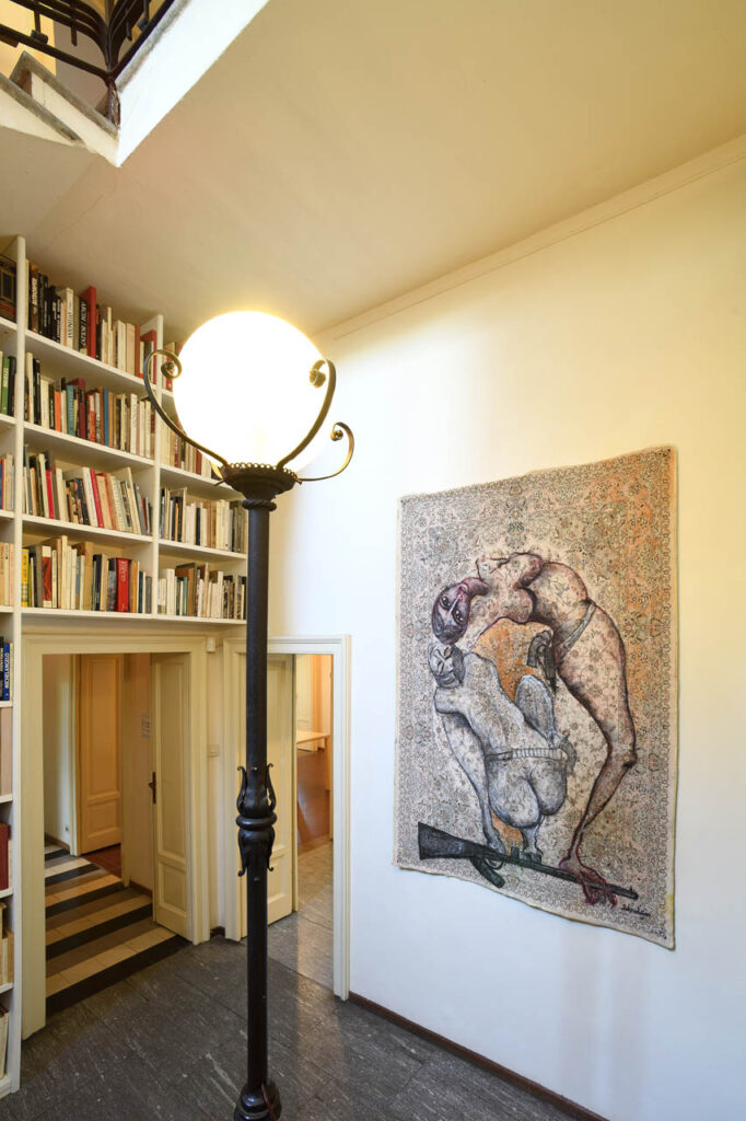 La grande sala comunica con la veranda che affaccia sul giardino. Qui è presentata la Tempesta, un’ installazione che si scompone