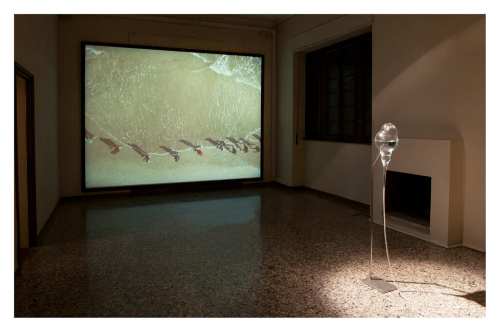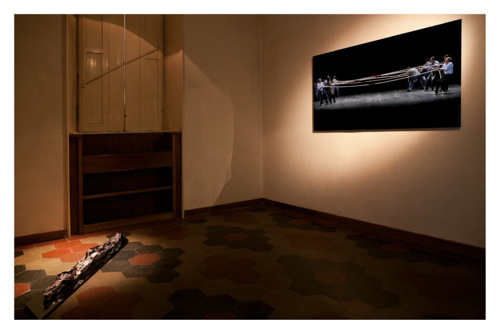 Nella sala è proiettato il video della performance di Filippo Berta, Forma perfetta del 2017. Un gruppo di persone sta cercando di mantenere