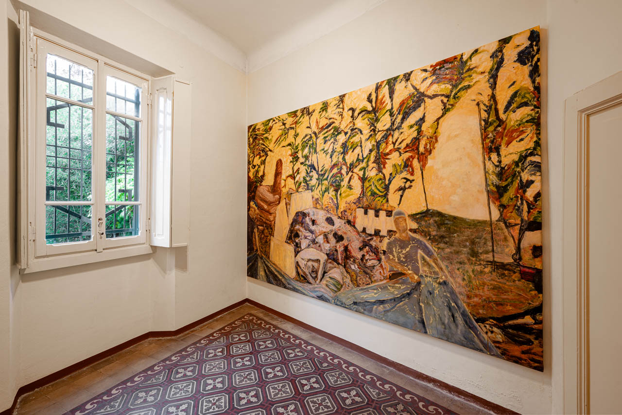 Silvia Capuzzo transforms painting into a gesture of care and resistance: bucolic figures try to protect a dying pile of ice from its rapid melting, guardians of a precious element and an elusive time.